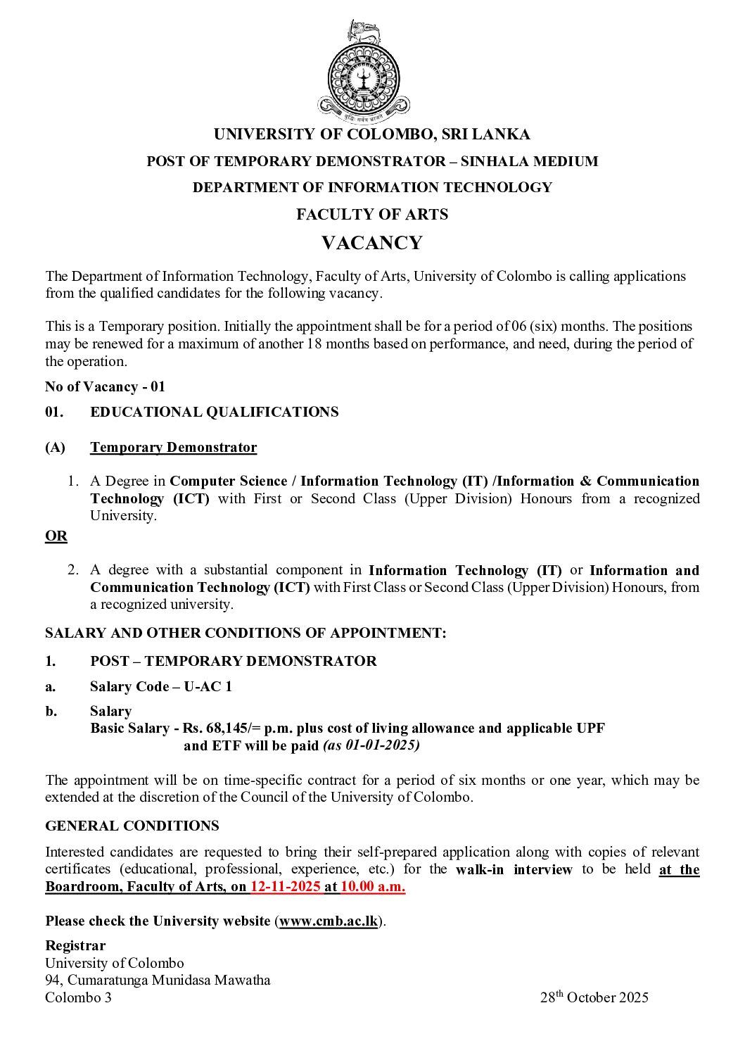 Post of Temporary Demonstrator