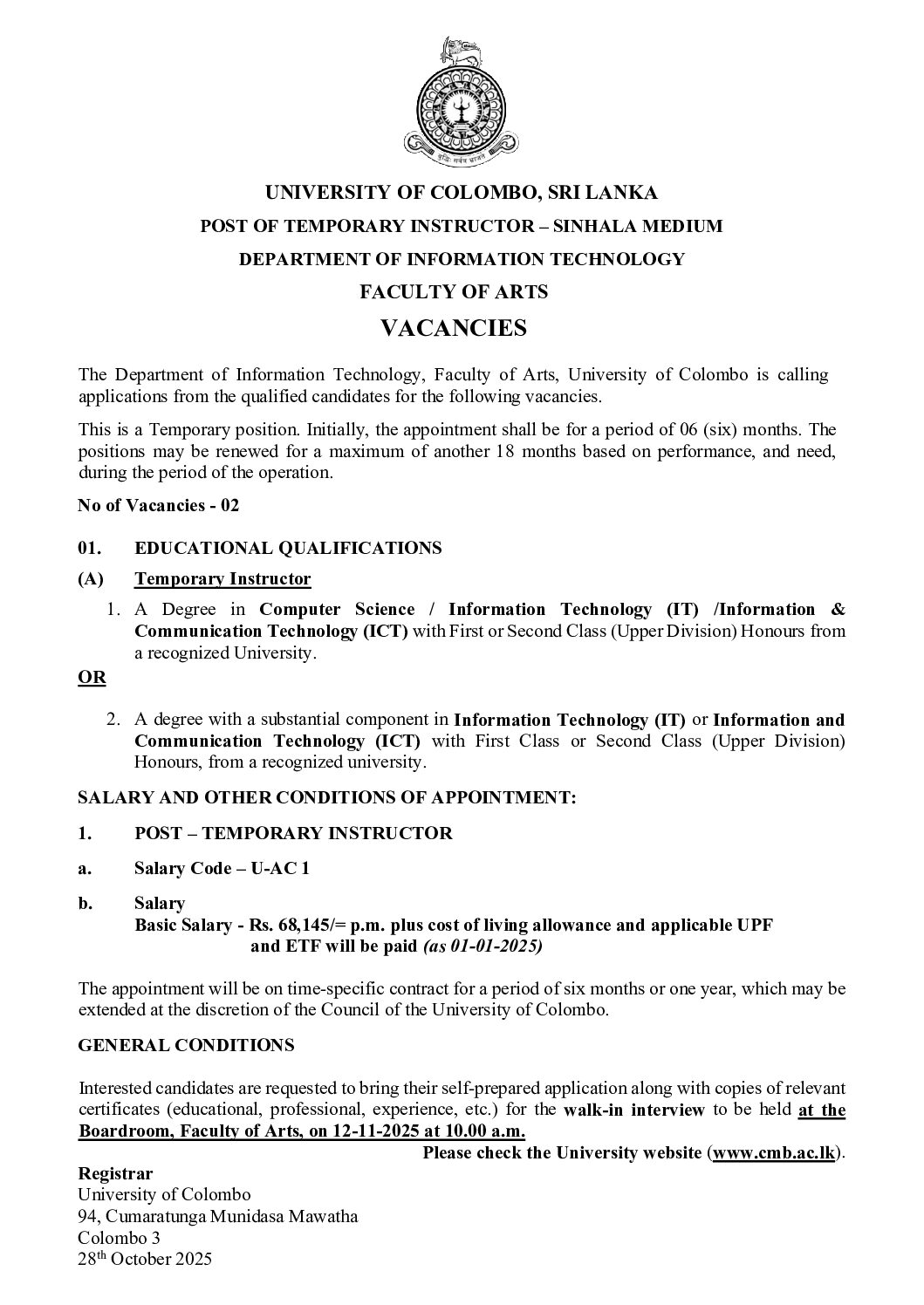 Post of Temporaty Instructor