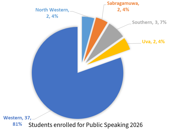 The Department of English, through its Extension Courses in English office, commenced its class on Public Speaking in English, and we are excited to have in this class, a diverse group of students! They are not only from the Western Province – committed learners visit the University every week from other provinces as well, as you can see. You can call the Extension Courses in English office and get more information or visit our website.