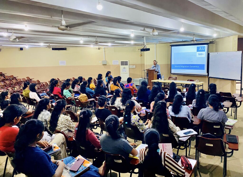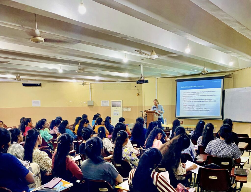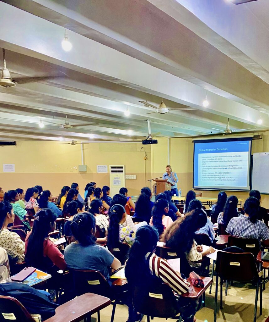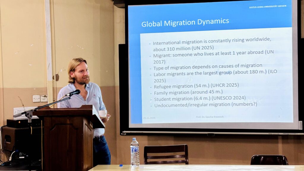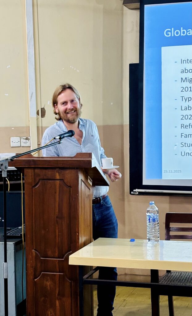 The Department of Demography, University of Colombo, successfully conducted a guest lecture series with Prof. Sascha Krannich, Professor at Justus Liebig University Giessen and IU Cologne, during his visit in November 2025. A total of two guest lectures were delivered, focusing on key areas in international migration. The first lecture, “World Migration Dynamics” for DMG 1204, was held on 25 November 2025 and explored global migration trends and the factors shaping contemporary population movements. The second lecture, “Terms and Concepts in Migration” for DMG 2218, took place on 26 November 2025 and introduced essential theoretical frameworks and core concepts in migration studies. Both sessions were highly informative and contributed meaningfully to students’ understanding of international migration, and the event was documented with photographs capturing the interactive learning environment.