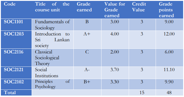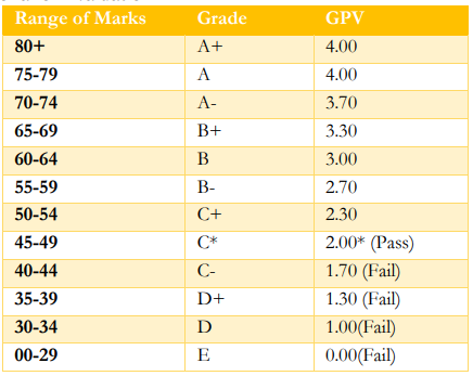In the evaluation process, the mark obtained by a student for each course is converted into a grade according to the scheme given in Table below. The grade point for each course unit is determined by the following grades: