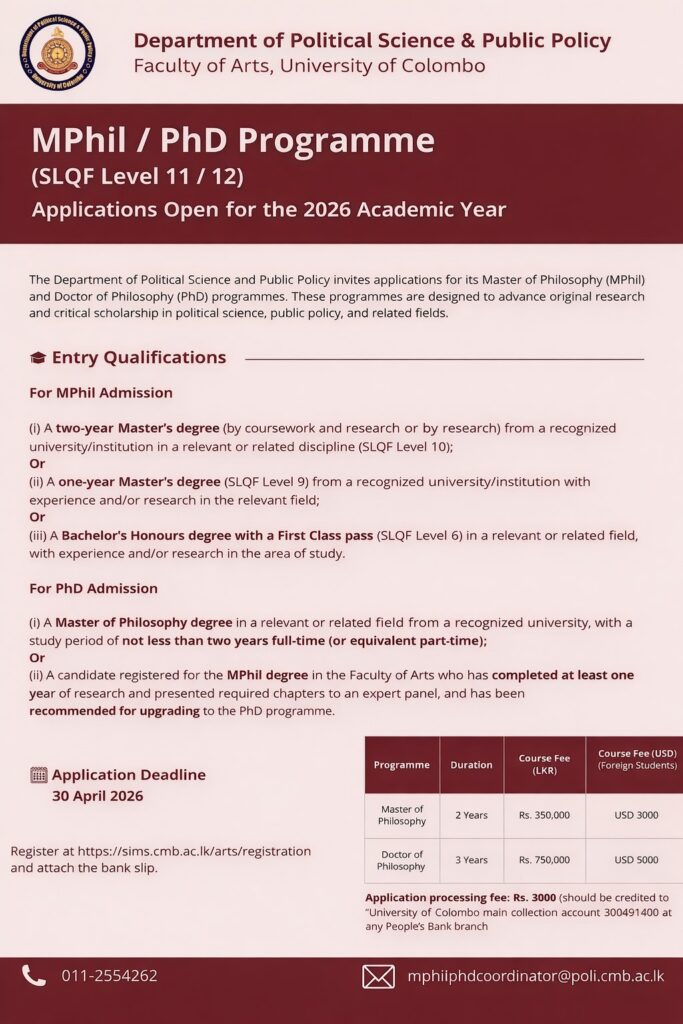 The department offers M.A, M.Phil and Ph.D programmes in Political Science by research. Candidates, with necessary qualifications, can apply through the Academic and Publications branch of the university.